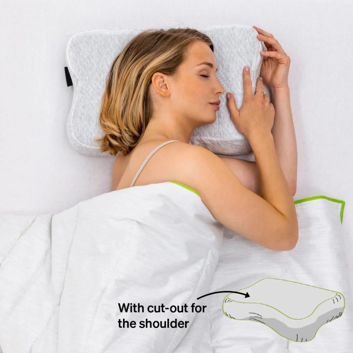 This pillow’s ergonomic shape supports the natural curve of your spine.